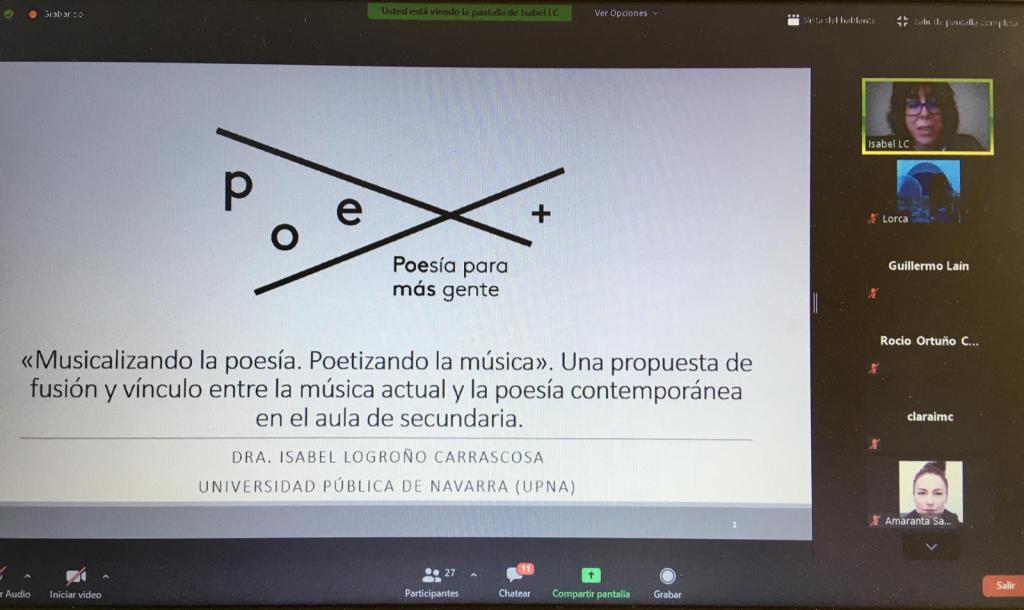 El 23 de noviembre tuve la oportunidad de participar en el II Seminario Internacional del Proyecto del Grupo de Investigación «PoeMAS. POEsía para MÁS gente. La poesía en la música popular española contemporánea”, coordinado por Guillermo Laín Corona y Clara. I. Martínez Cantón, ambos profesores de la Facultad de Filología hispánica de la UNED y que tiene como objetivo estudiar las relaciones entre la poesía y la música popular actual. El seminario, que en esta segunda edición tuvo por nombre «Sonando en verso», se extendió a lo largo de todo el día, con intervenciones de muy diversa índole poético-musical, como puede verse en el programa. Dadas las circunstancias de la era COVID que vivimos, el seminario se realizó de forma telemática a través de la plataforma Zoom con una estupenda organización y fluidez por parte de sus coordinadores y participantes.