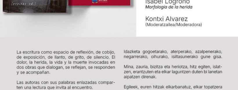 El pasado viernes, 23 de enero, tuve la oportunidad de participar en un diálogo alrededor de la "herida" moderado por la dinamizadora literaria, Kontxi Álvarez, autora de la reseña de mi poemario, Morfología de la herida (Loto azul, 2025) y guía de la presentación que realizamos conjuntamente el pasado septiembre en Geltoki. Esta vez, el … Sigue leyendo «Decir la herida», junto a Uxue Razquin y Kontxi Álvarez en Librería Txalaparta